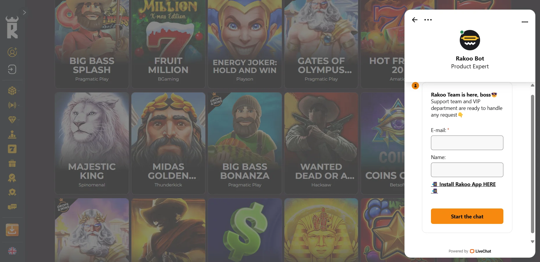 Bij Rakoo Casino staat de ondersteuning voor spelers centraal. Het casino biedt een livechat die 24/7 beschikbaar is, zodat u bij al uw vragen rondom registratie, bonussen en algemene informatie snel geholpen wordt. Daarnaast kunt u contact opnemen via e‑mail op [email protected].