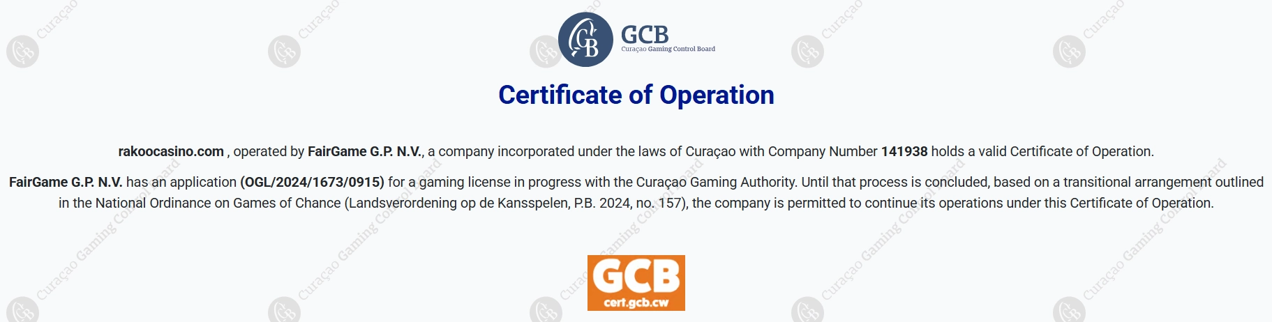 Rakoo Casino is volledig gelicentieerd en gereguleerd door de regering van Costa Rica, wat een zekere mate van betrouwbaarheid en integriteit garandeert. Deze licentie, met nummer 3-102-871832, verzekert spelers dat het casino voldoet aan de gestelde eisen voor veilig en verantwoord gokken. Of je nu stortingen doet of opnames uitvoert, alles verloopt via het SSL-encryptiesysteem, wat betekent dat je persoonlijke en financiële gegevens altijd goed beschermd zijn.
